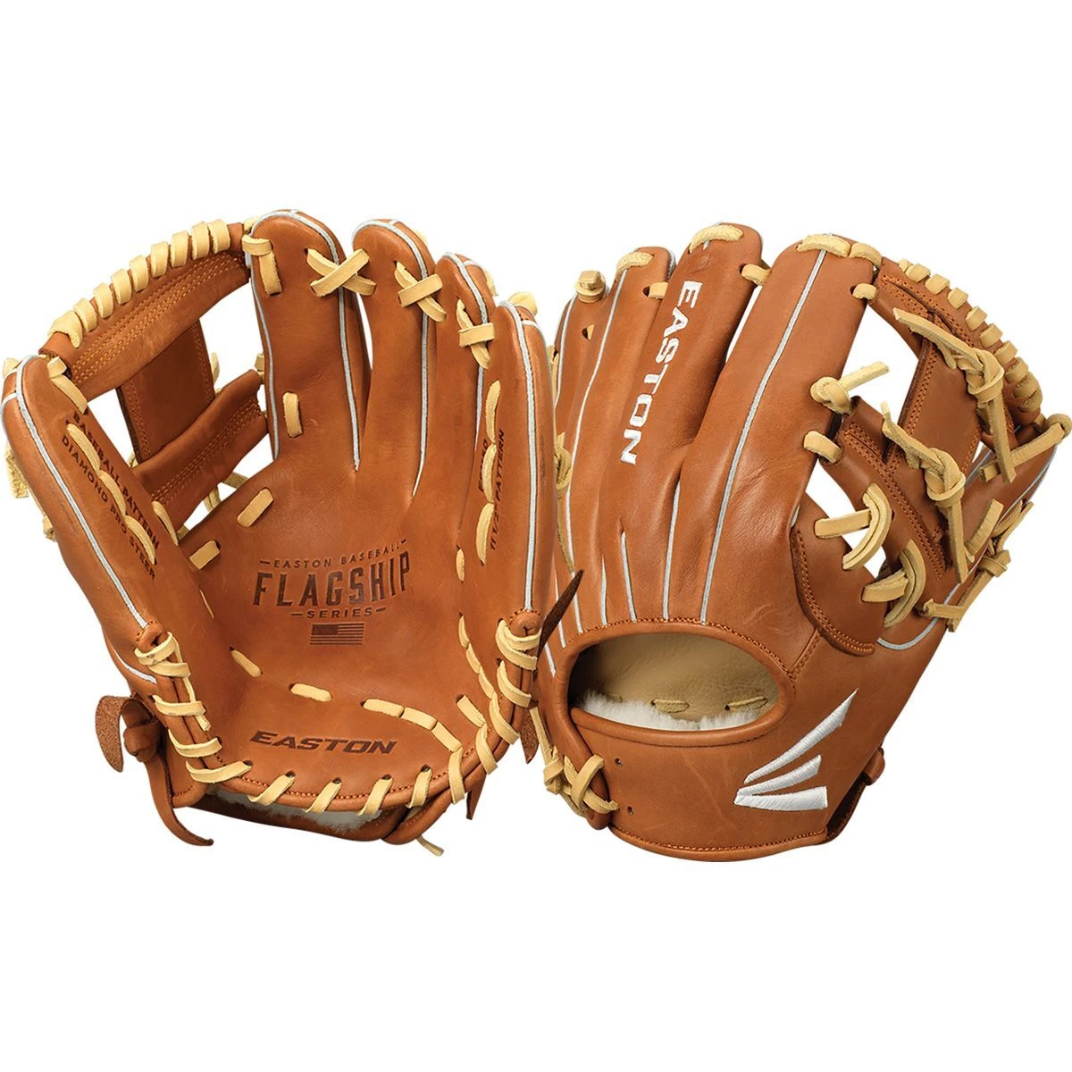 Easton’sยฎ new Flagship Series was built for performance at every position. The series is crafted of a Diamond Pro Steerโข leather shell and an oiled classic cowhide palm and finger lining for improved feel. The split grain leather welting adds rigidity and strength, reinforcing the shell shape, and the steerhide binding increases overall glove longevity. The Flagship Series features pro grade rawhide laces for extra pocket durability throughout the season, and a luxurious sheep wool shearling fur wrist liner for maximum comfort.ย