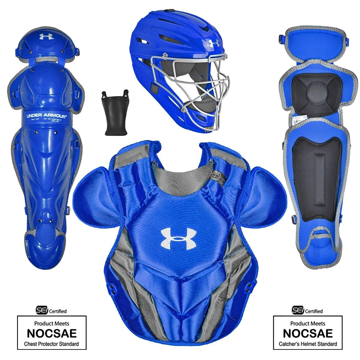 Under Armour Converge Victory Series Senior Catchers Gear Set UACKCC4-SRVS (ages 12-16) is complete with the gear needed to have an effective game behind the plate. This unique Under Armour catchers gear set is the ideal purchase for player development. The Under Armour brand is consistent and reliable. Therefore, this Under Armour Converge Victory catchers kit comes complete with hockey style helmet (7 – 7 1/2), over the shoulder chest protector (15.5″ inch) and lightweight leg guards (14.5″). The Under Armour Converge Victory Series Senior Catchers Set kit offers the comfort, performance and technology all serious athletes need. It also comes at an affordable price. Therefore, theย Under Armour Converge Victory Series Senior Catchers Gear Set UACKCC4-SRVSย is perfect for the up and coming, inexperienced ballplayer. It also is ideal for the seasoned ballplayer looking to up his level of play. The Under Armour catchers gear set is available in four colors. ( black, navy, red, royal). So, be sure to match your team colors with this catchers gear set.